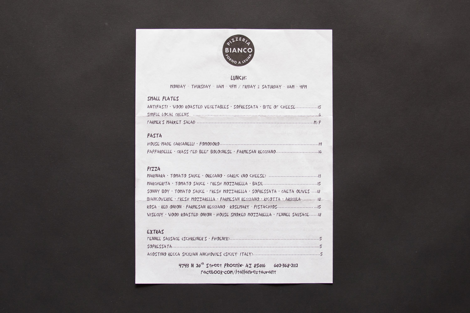 Pizzeria Bianco Menu