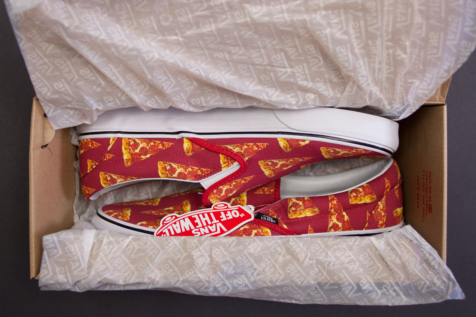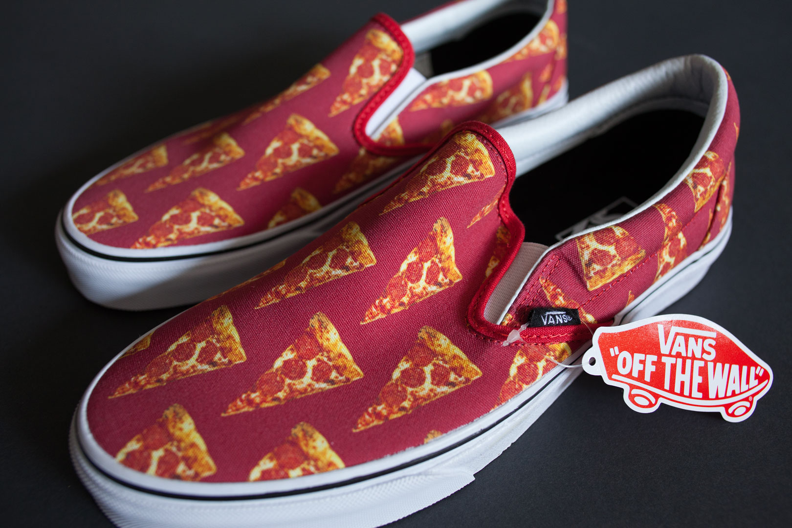 Brothers Paul Van Doren and James Van Doren, Serge D’Elia, and Gordon Lee opened the first Vans store in Anaheim, California on March 16, 1966 with a total inventory of 12 pairs of shoes. Celebrating their 50th anniverary in 2016, one of their new releases features pepperoni pizza slices floating on a red classic slip-on.