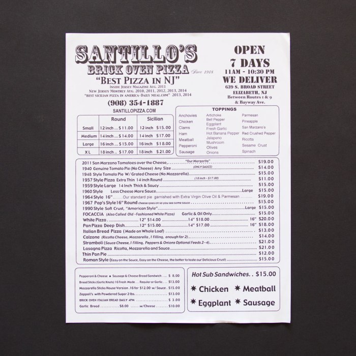 Santillo’s Brick Oven Pizza Menu Santillo’s Brick Oven Pizza Elizabeth, NJ, circa 2015 8.5 in. x 11 in. U.S. Pizza Museum Collection Acquisition Date: 06/19/2015 ID: USPM0117 The Santillo family has been delivering bread and making focaccia since 1918 and starting making their iconic pizzas in 1950. […]